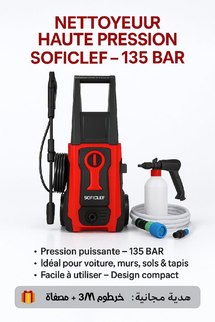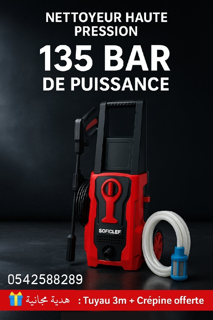 nettoyeur haute pression Soficlef 135 bar +هدية crépine مع خرطوم 3 أمتار